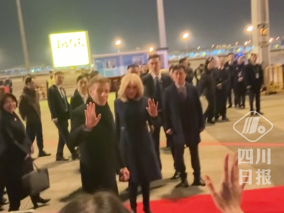 C视频丨马克龙夫妇抵达成都,向川观新闻记者挥手问好