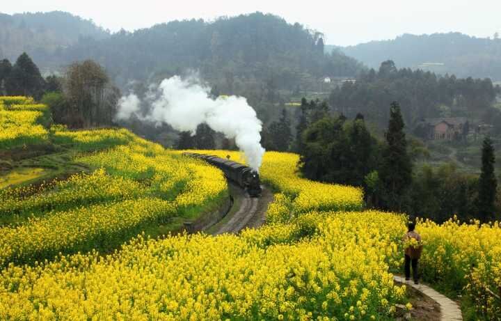 犍为县嘉阳小火车穿过油菜花海。(乐山市文广旅局供图)