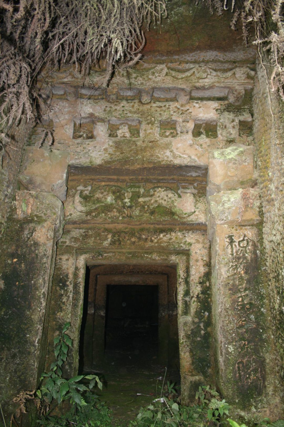 在艾叶雷公坡,有24座墓葬,环形分布于一马鞍形低丘的一面缓坡上,艾叶人都称为“蛮子洞”。各墓葬形制接近,由墓道、墓门、甬道、墓室等部分组成。墓道为露天式,顺自然坡势横向垂直于山体,墓葬底部的整体特征是内高外低,向外倾斜。墓室两壁保留有开凿崖墓时架设碓架的不规则圆孔。门廊位于墓道与墓门之间,平面呈梯形,墓门两重递缩式,立面均呈长方形。第一重门门楣正中阴刻一组菱格纹、三角纹组合图案,两端为一组二联对置三角纹,墓室右壁上可清晰看见双鱼、刀剑等图案。该崖墓群是自贡市迄今发现的规模最大、数量最多的汉代崖墓,对研究东汉时期自贡地区的经济和社会发展具有重要的历史和科学研究价值,同时也丰富了川南地区崖墓类型资料,对于四川地区的崖墓研究、区域美术史、思想史、科技史研究都有着重要的参考价值。