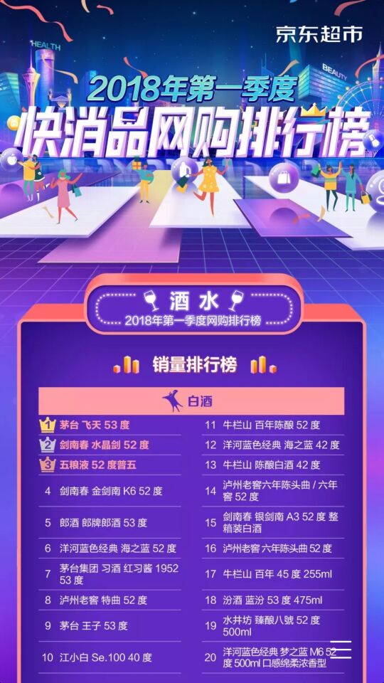 4月26日,京东发布2018年一季度快消品销售排行榜,在白酒版块“茅五剑”表现抢眼,其中,剑南春在销量前五强中独占两席:52度剑南春销量排名第二、52金剑南K6销量排名第四,此外52度银剑南A3销量排名十五位。