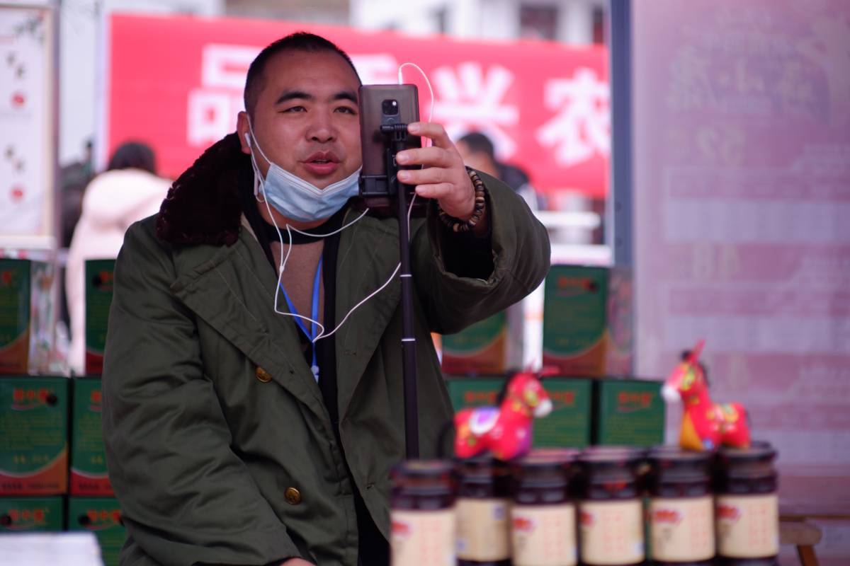 杜毅通过手机直播推销系列毛驴制品。