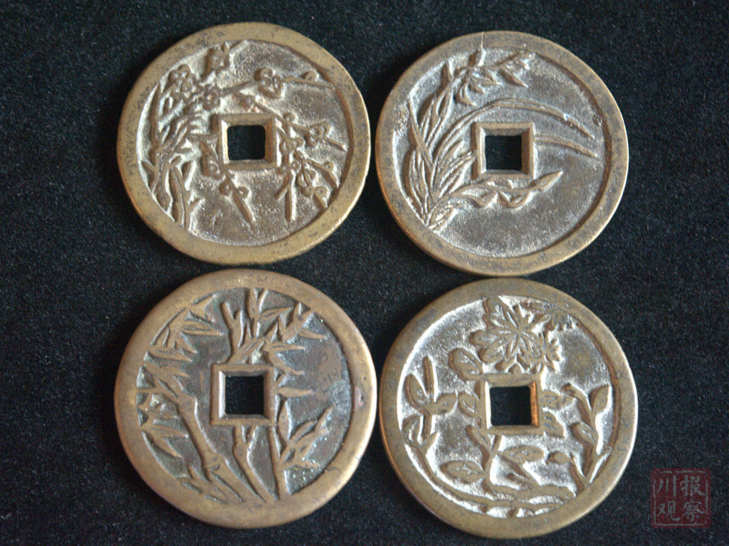博物馆收藏的一件汉代钱币,看上去是一枚放大版的“刀币”。它有10余厘米长、7-8厘米宽,正面铸有“八千万”的字样。李可说,这种钱币在当年并不用于交换,只是作为一种财富的象征。博物馆收藏的古代“纪念币”中,有刻着“忠孝传家”的,也有“进德修业”的;一套清代的“花钱”,则把梅兰竹菊“四君子”都铸了上去,背面还用不同字体刻上“而今未问和美事,先向百花头上开”等诗句。