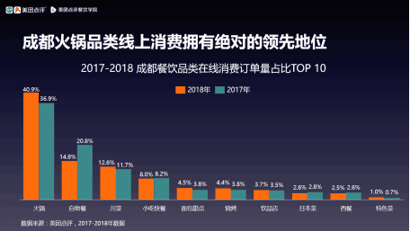 该报告指出,中国餐饮收入已突破4万亿,成都餐饮门店增速高于全国。大好的餐饮行业发展趋势,充分说明了成都人民对于“吃”的热情。2018年,火锅是全国范围内餐饮线上消费最火的品类,消费占比达20.3%。