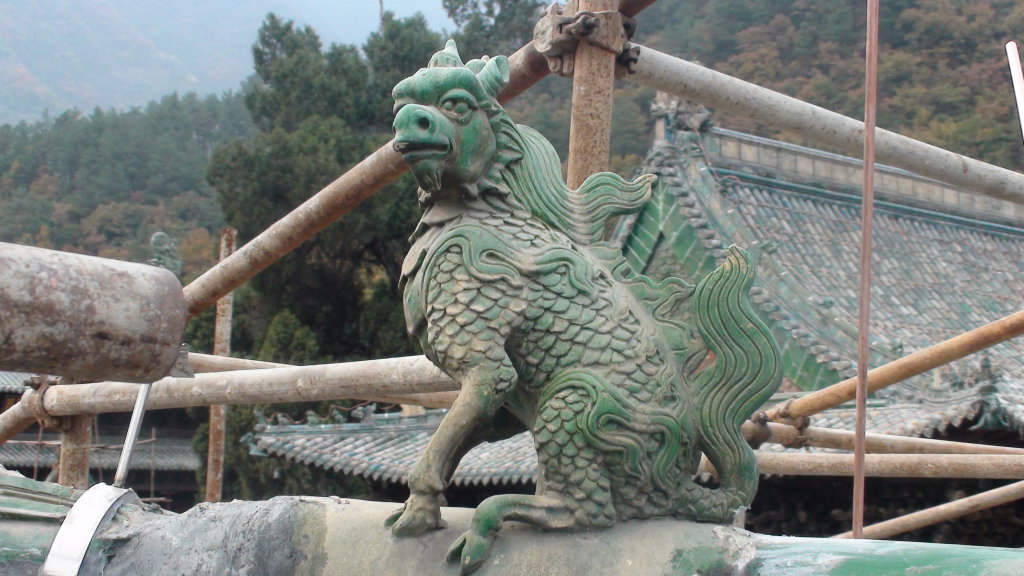 从刘海波拍摄的万佛阁施工影像资料上可以看到,工人们先将屋面琉璃瓦全部编号后再小心搬离。未来,它们将按编号重新复原。屋脊上的鸱吻瑞兽,也全部整体拆卸下来重新修补。