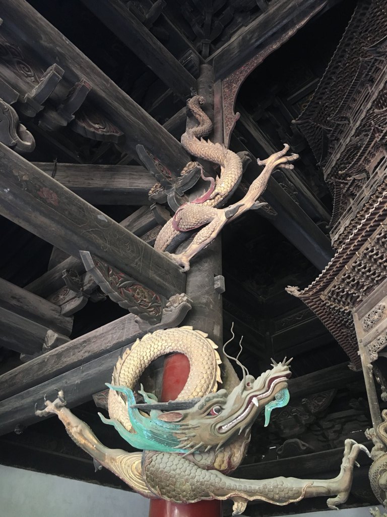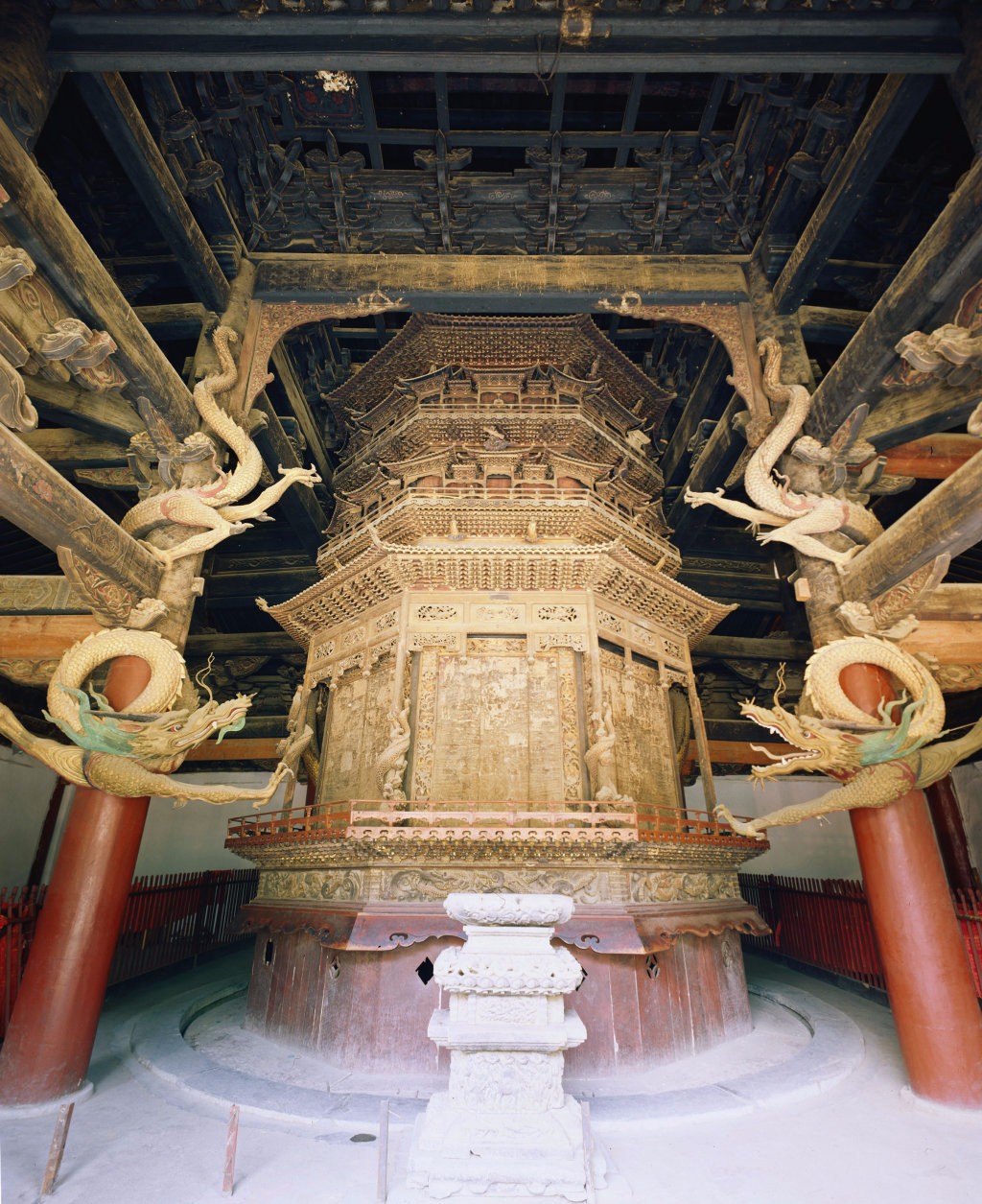 以报恩之名修建的寺院,王玺和他的儿子王鉴前后花了20年时间精心营造。苏洪礼说,报恩寺有“六绝”:媲美北京法海寺的彩绘壁画,全国唯一还能转动的明代转轮经藏,整木木雕的千手观音像,样式繁多的斗拱,有近万条龙装饰,以及建筑全部采用金丝楠木等,它们共同汇成明代建筑之精美的真实写照。“即使在故宫,金丝楠木也只使用在木柱等主体结构上。寺中无处不在的斗拱,比故宫的斗拱样式还要多。”