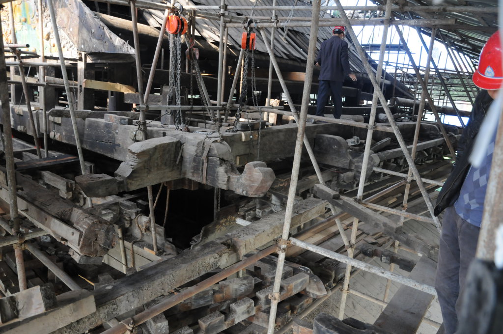 工作人员先在万佛阁四周搭起坚固而密实的钢架。钢架之上,则用多组千金顶将屋面整体往上抬升。此时,屋面已用钢丝绳链接为一个整体,可以有效防止抬升时散架垮塌。每天,数吨重的屋面只能缓慢上升5厘米!严密监控之下,万佛阁的几重屋面在7天内,全部有惊无险完成抬升。工人用钢钎戳打整木抬梁,果然发现糟朽近半,必须更换。