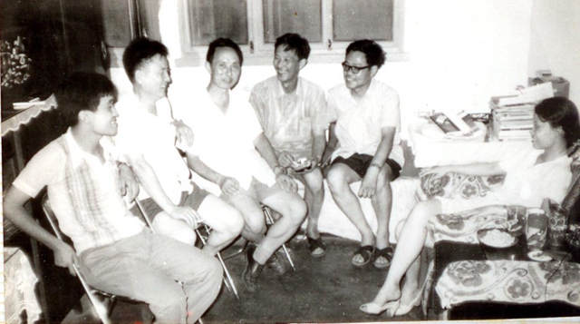 1981年夏,众科幻友人在上海科幻作家缪士(原名嵇伟)家中小聚:(左起)吴岩、黄廷元、刘兴诗、王晓达、叶永烈、缪士。