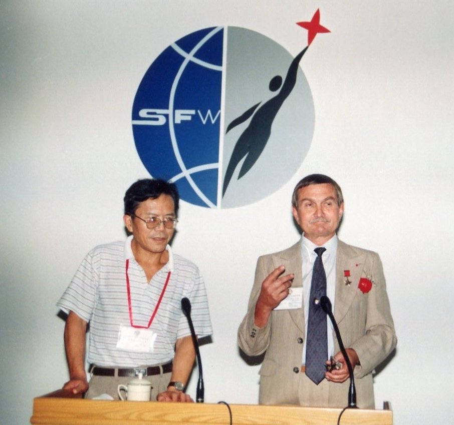 1997年7月,在太空飞行211个昼夜的俄罗斯宇航员、俄罗斯宇航联合会副主席安·尼·别列佐沃依上校(右)于北京国际科幻大会开幕式上发言