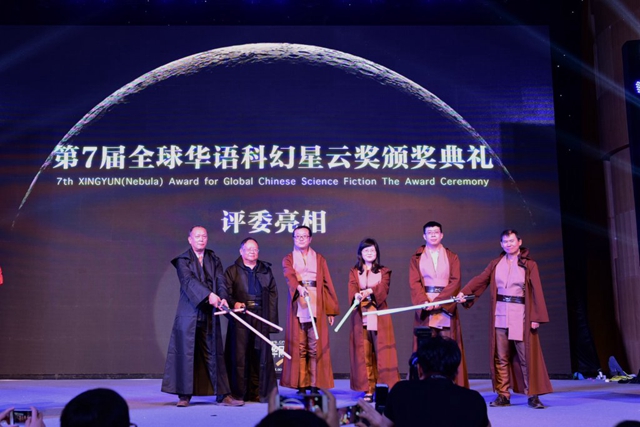 在第七届全球华语科幻星云奖颁奖典礼上,评委以“星战”武士造型闪亮登场:(左起依次为)刘兵、董仁威、刘慈欣、杨枫、姜振宇、喻京川