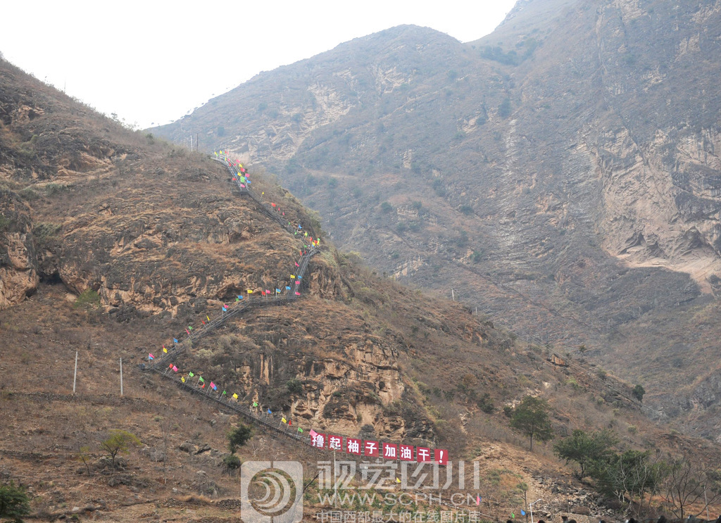 通往悬崖村的钢架天梯,沿着陡峭的山路顺山而建