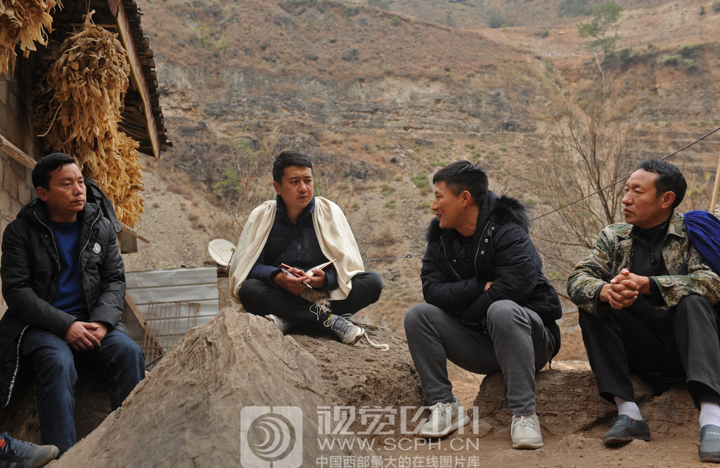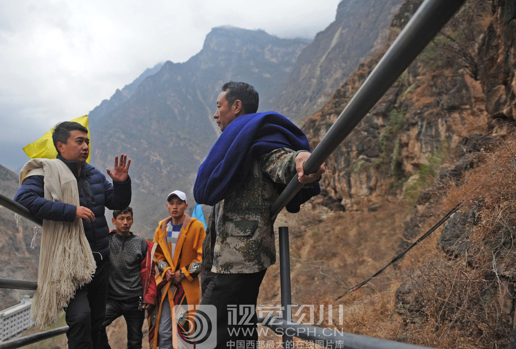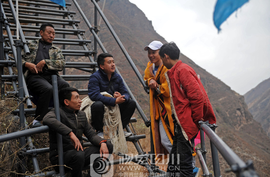 阿吾木牛代表(左)在钢架天梯上与村干部们一起研讨当前悬崖村旅游发展急需解决的应对措施