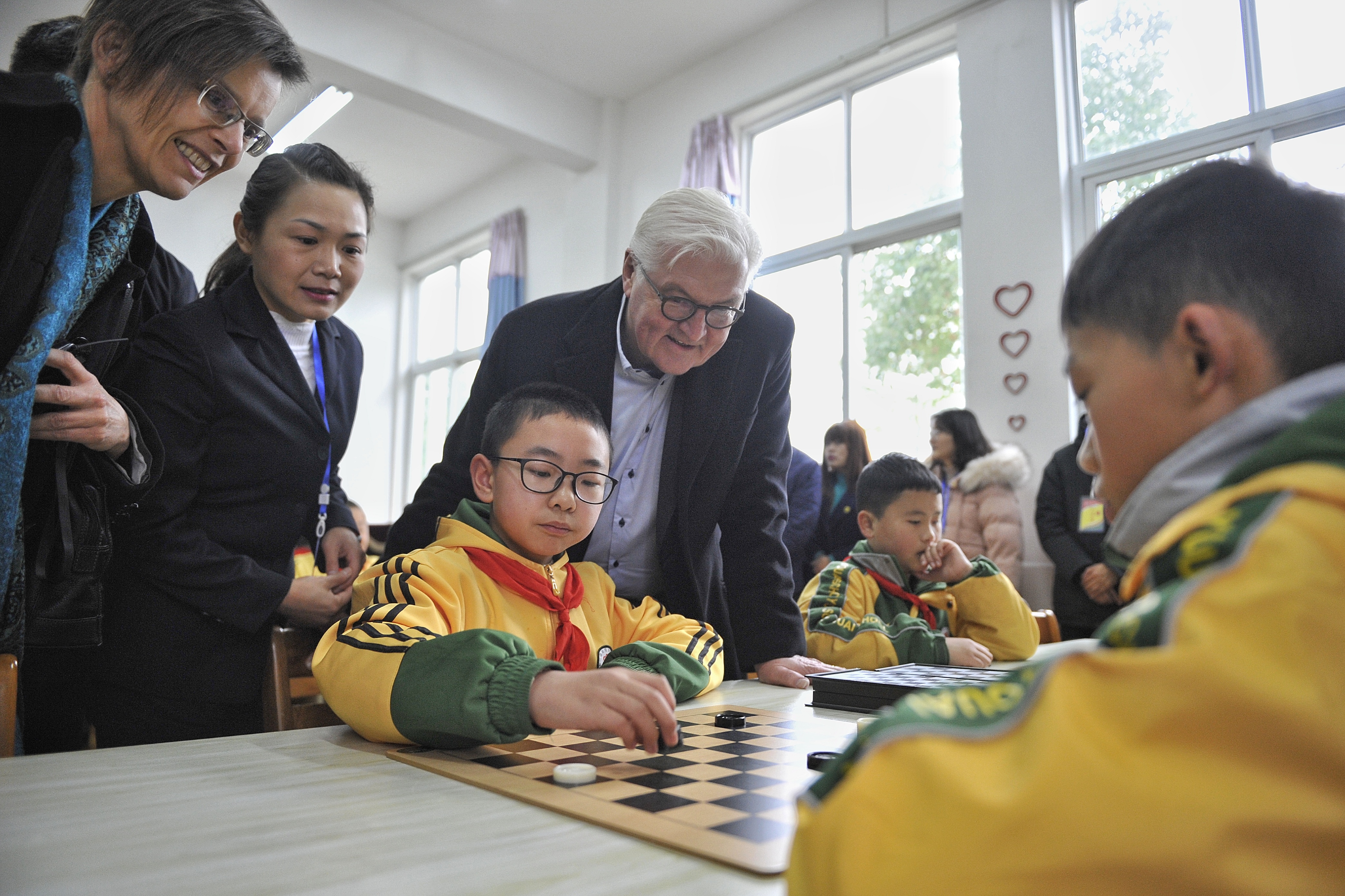 一路寒暄,欢声笑语不断。施泰因迈尔来到国际跳棋互动教室,和同学们对弈。他还观看了同学们表演的中国鼓,并亲自上阵,和同学们PK起了鼓技。