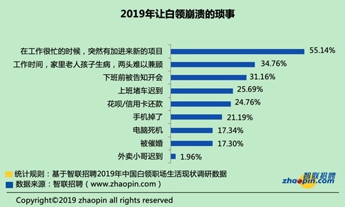 对于引发崩溃的原因,数据显示,让白领崩溃的琐事排行中,排名前四的原因均与工作有关。有55.14%的白领会因为在繁忙中遭遇工作“插队”而崩溃, 34.76%的白领因为工作忙无暇顾及家庭而崩溃。有分析人士认为,干不完的工作是导致白领崩溃的主因。