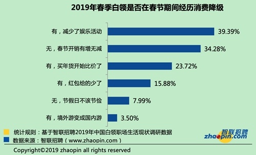 在对白领今年春节是否经历过消费降级调研时发现,39.39%的白领表示春节期间减少了娱乐活动,23.72%的白领买年货开始比价了,有15.88%的白领在给红包的时候没那么大方了。同时,也有34.28%的“土豪”白领,春节开销有增无减。总体来看,大部分白领在春节期间都经历了消费降级。