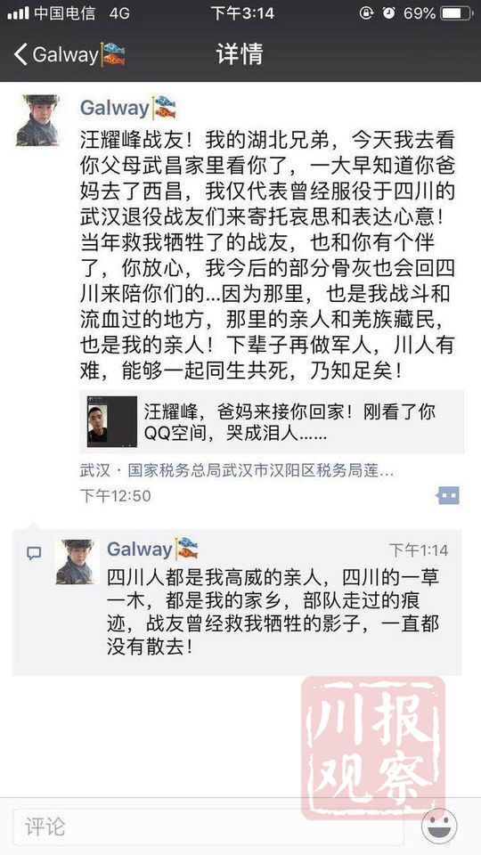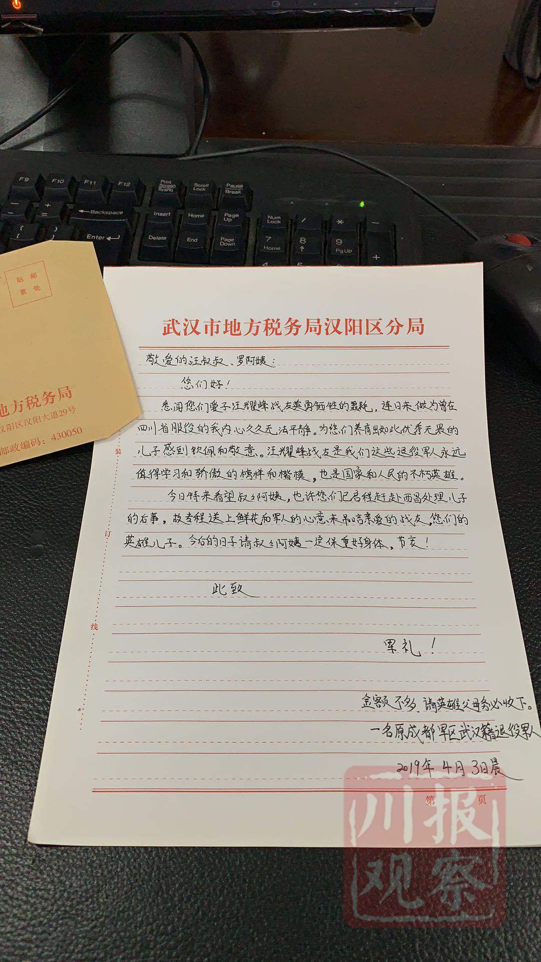 高威告诉记者,他从媒体上得知木里森林火灾中英勇牺牲的一位烈士是湖北人后,就自发前往烈士父母位于武汉市的家中吊唁。他在慰问信中写道:“为你们养育出如此优秀无畏的儿子感到钦佩和敬意,汪耀峰战友是我们退役军人永远值得学习和骄傲的榜样和楷模……特意送上一份心意吊唁亲爱的战友。”