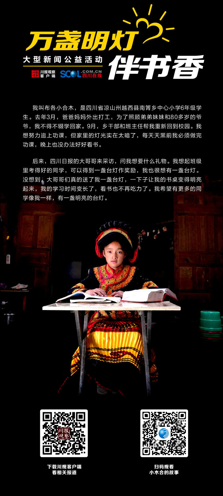 昨(20)日,川报全媒体集群四川日报、川报观察、四川在线等媒体推出的报道《夜晚的台灯,点亮彝族小姑娘梦想》,小合木一句“台灯照亮了我学习的道路,我会努力学习,考上大学”,在线上线下引起强烈反响。许多网友表示,万万没想到,对于城里孩子而言很常见的一盏台灯,竟然成为山区孩子久久念想的难得物品,希望能够为更多孩子送去一盏台灯。