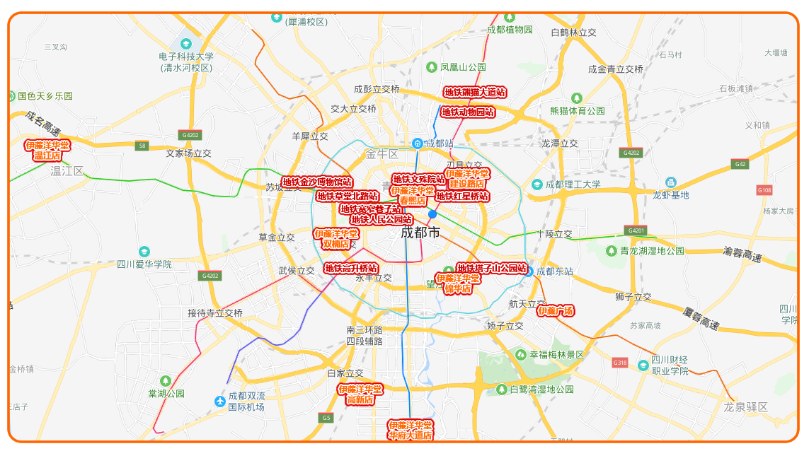 春熙店、双楠店、锦华店、建设路店、高新店、温江店和伊藤广场(绿地468)、伊藤食品生活超市(蓝润置地广场)。