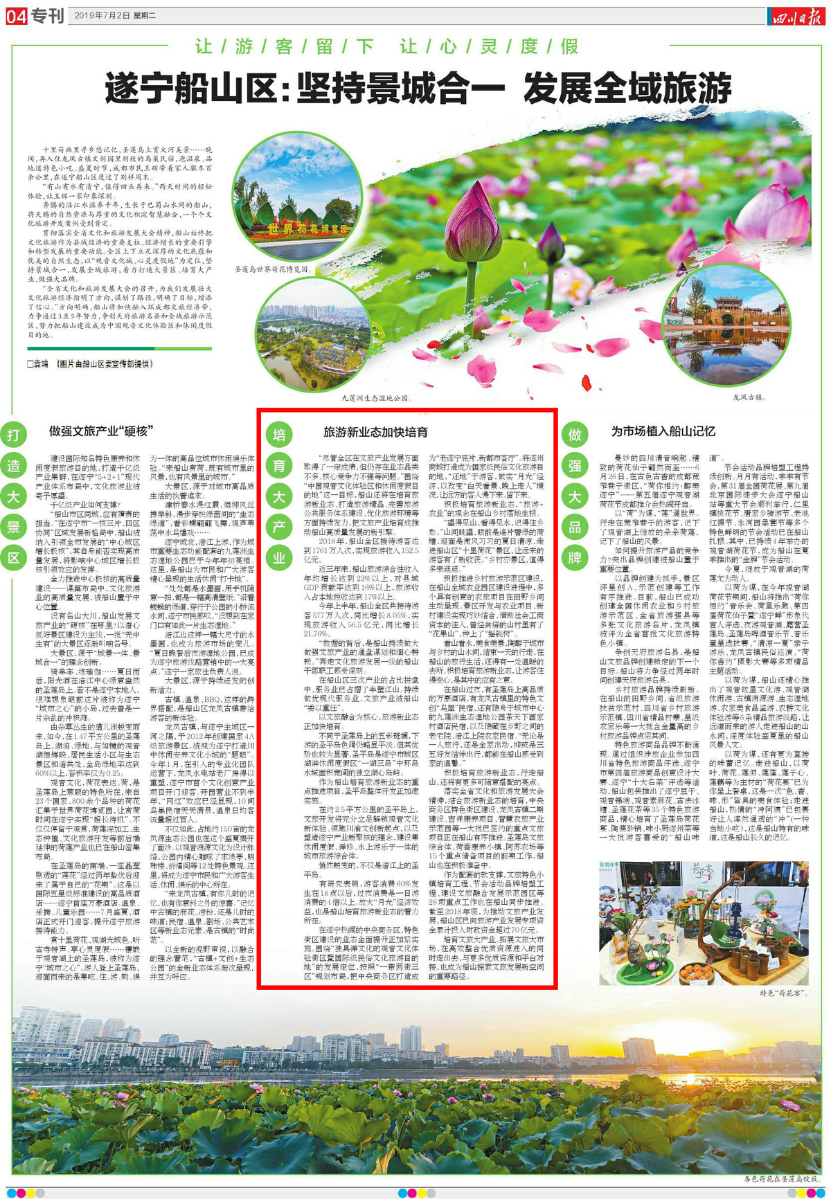 7月2日,《四川日报》推出专题报道,从景区建设、产业培育、品牌塑造等多个维度梳理船山区推进文旅产业发展的系统谋划,全方位介绍船山区文旅产业发展的探索与实践。