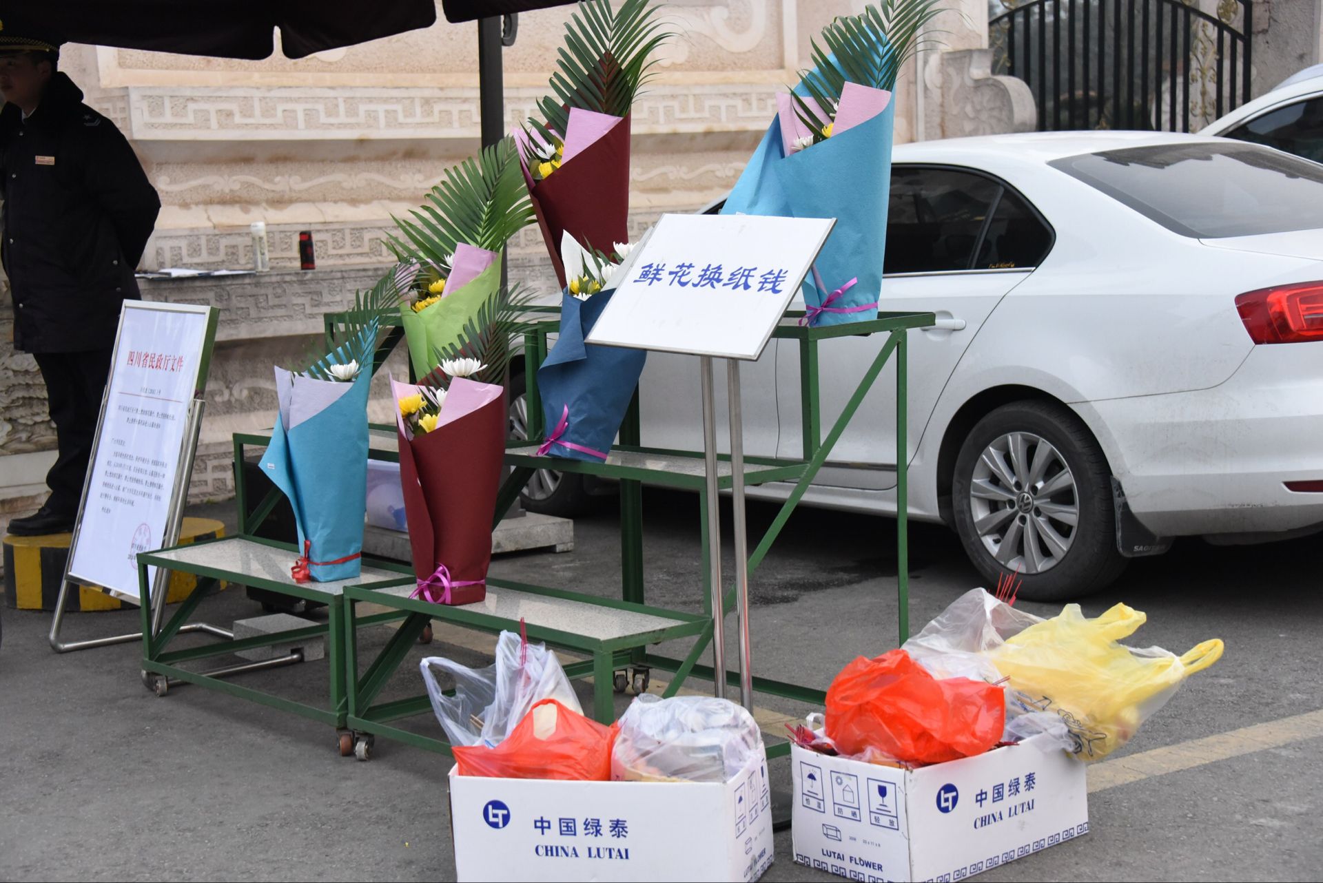在陵园的鲜花换纸钱柜台,工作人员免费给童大爷他们换了两把鲜花,“母亲生前爱花,相信他们会更高兴的。”童大爷说,用鲜花代替传统祭品,他理解也支持,“空气好了,环境也更优美。”