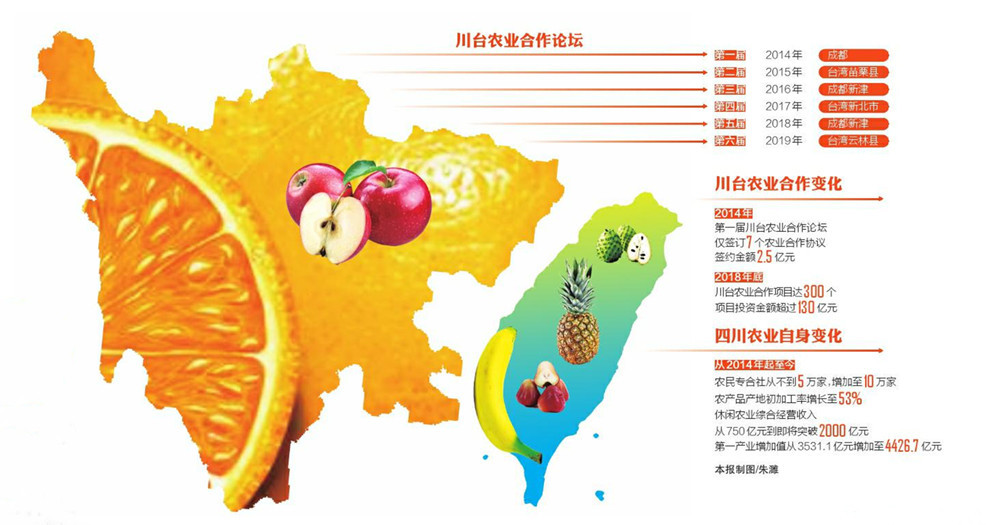 第一届川台农业合作论坛,双方仅签订了7个农业合作协议,签约金额2.5亿元人民币,但到2018年底,川台双方的农业合作项目便达到300个,项目投资金额超过130亿元,合作的范围从单纯的农业生产向农产品加工、生态有机农业、休闲观光农业等多个领域拓展。
