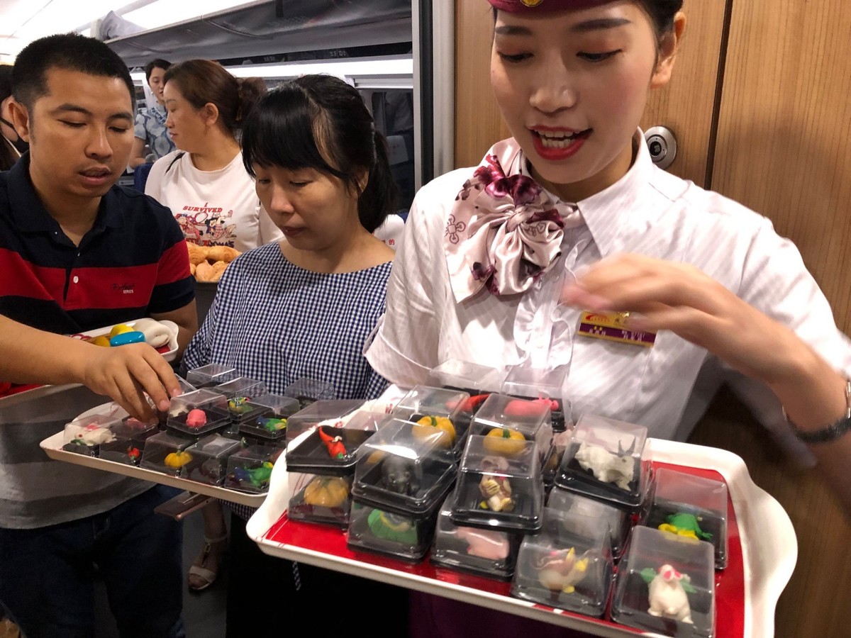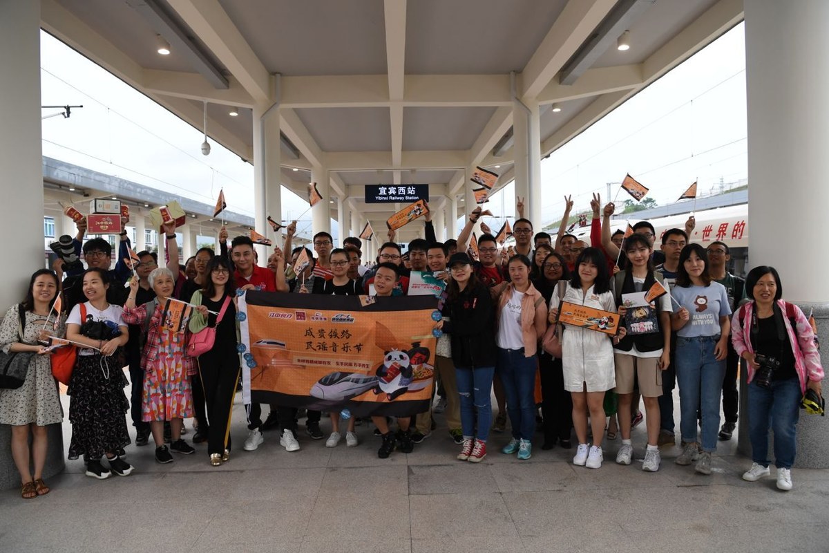 中国铁路成都局也给旅客们带来不少惊喜,“动妹”给旅客们发放横江眉毛酥、泥溪芝麻糕、柏溪潮糕等宜宾特产,“关河船工号子”传承人冯旭奎带来原生态的非物质文化遗产表演,现场制作宜宾面塑等。