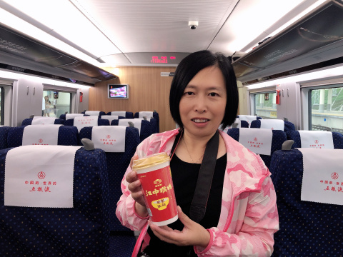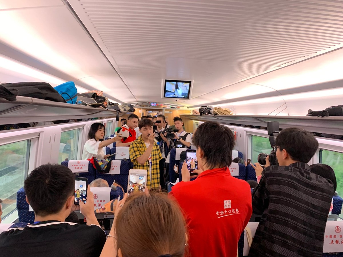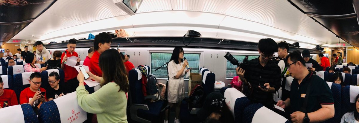 首发列车上,川报观察举办“江中猴姑米稀· 成贵铁路民谣音乐节”,在动车上吃着米稀唱着歌,欢乐不断。