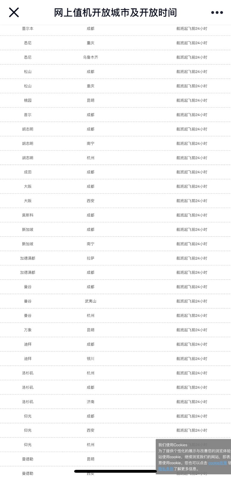 好消息!记者7月2日从四川航空获悉,川航首次开通境外始发航站的网上值机功能,从墨尔本、洛杉矶、温哥华、罗马、苏黎世、莫斯科、新加坡、大阪等境外27个航站始发回国的川航航班,可以在网上值机啦!