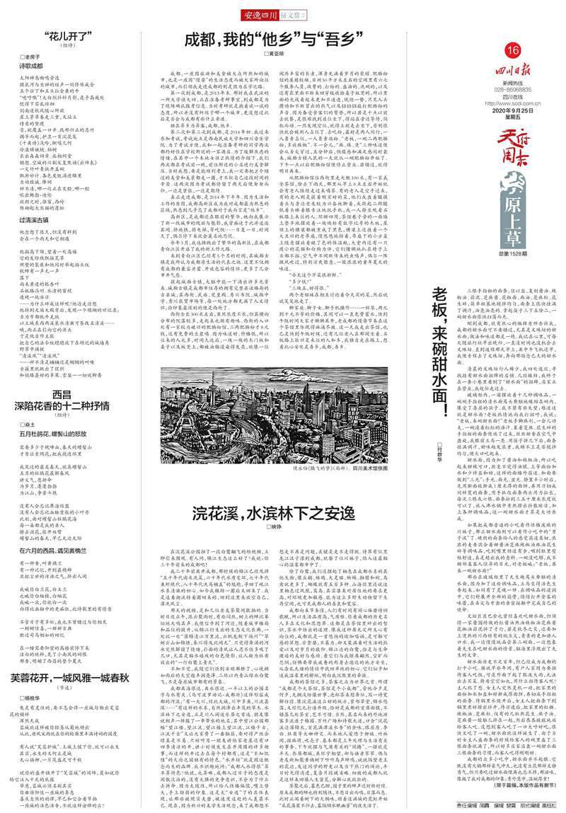 “散花楼”“龙门阵”“摩柯池”“岷江评论”“大家”“名家专访”“天府好书榜”“品读”“读书会”“好书品读”“博物志”“镇馆之宝”“地方志”“街巷”“解谜”“秘境”“钩沉”“时光”“名角”“艺声”“剧说”“有戏”“精神杂粮铺”等栏目和版面次第上演,打通中西,勾连古今。