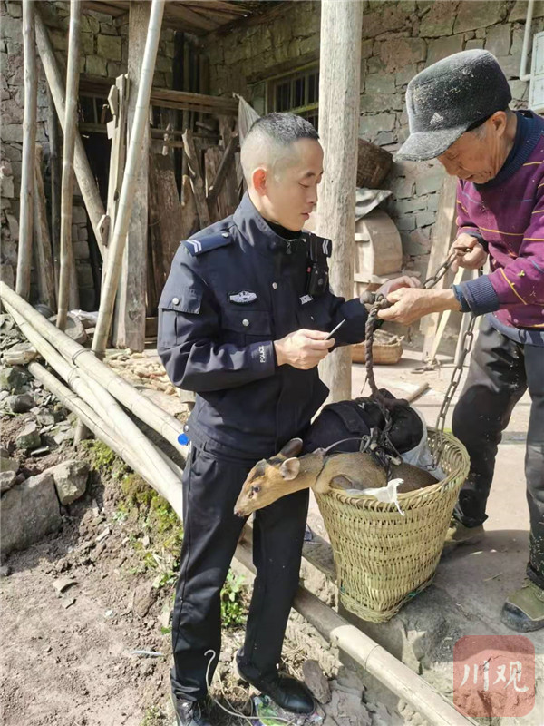 “必须给它治伤,不然易再次被捉住。”谢亮在村民家找来背篓,抱起麂子放进背篓,盖上自己的外套,以免它翻出背篓后逃跑。随后,同事辅警邓志刚背着受伤的麂子,一路徒步行进了3公里,才找到停路边的警车,后将其带到土黄镇场镇,找了家私人诊所,为动物治疗伤势。