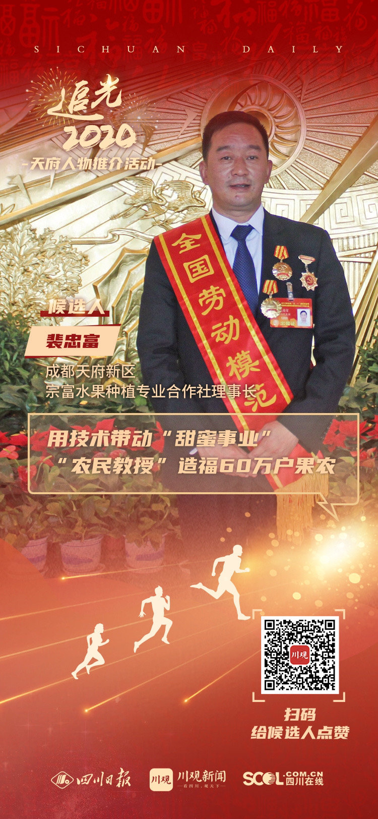 今年50岁的裴忠富出生农民家庭。小时候,因家境贫寒,初中还没念完他便辍学回家种植水果,自己尝道甜头,就以一句“跟着宗富干,保证有钱赚”的承诺,动员乡亲们一起种植水果,发展“甜蜜事业”。30多年来,他先后在川滇黔等地的60多个县市区、200多个乡镇推广优质果树,经他手推广种植的水果面积约300万亩,他和团队长期进行技术跟踪服务,成为诸多果农心中的“农民教授”。经他带路扶助,一批批地道的普通农民成功脱贫致富。
