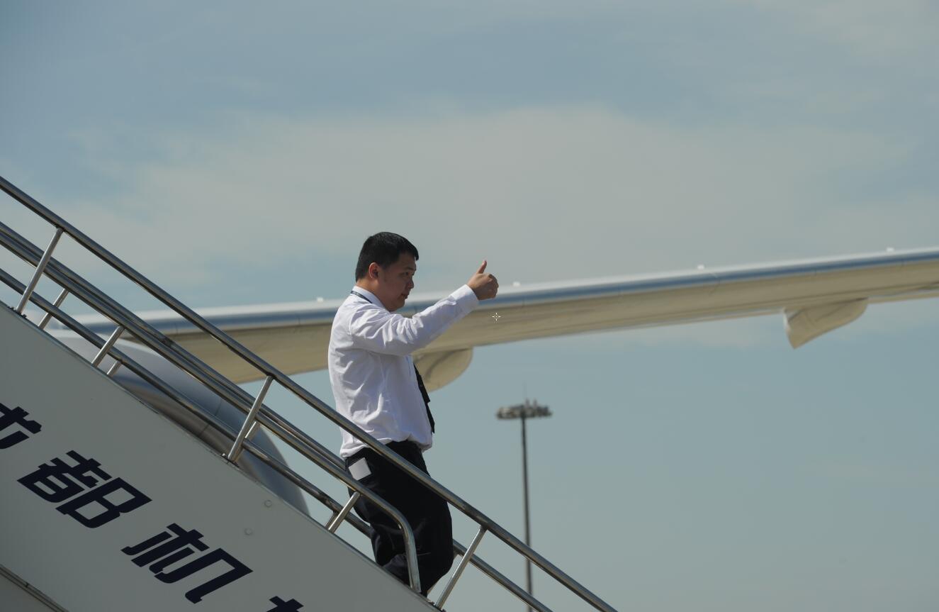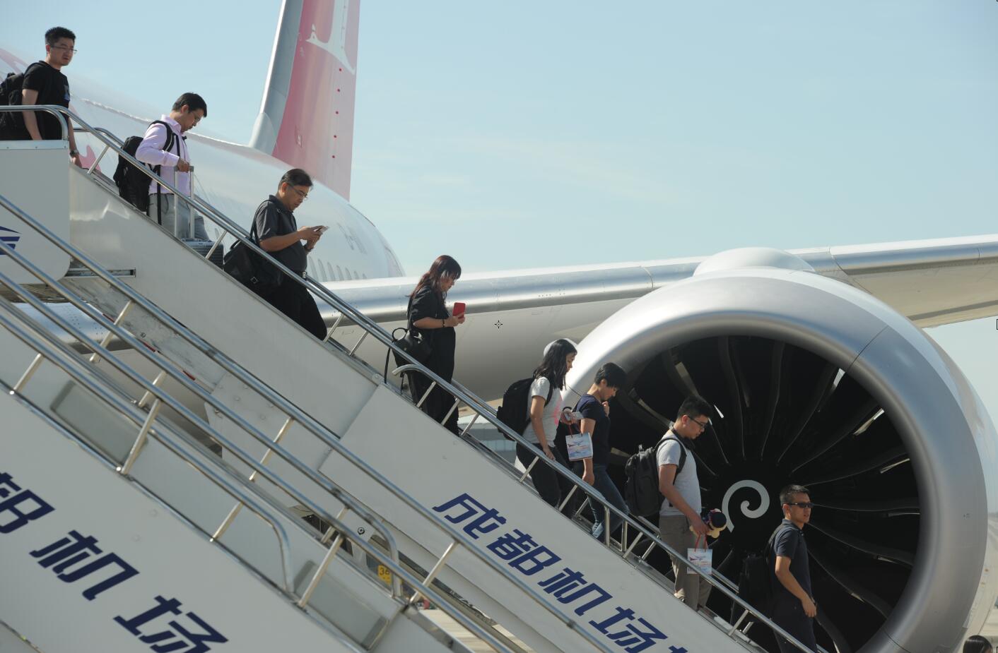 走下悬梯后,不少旅客掏出手机和飞机合影。回成都过国庆节的乘客孙浩就是其中一位,他说,得知东航这架飞机要首航成都,特意买的这个航班,专程体验新飞机。