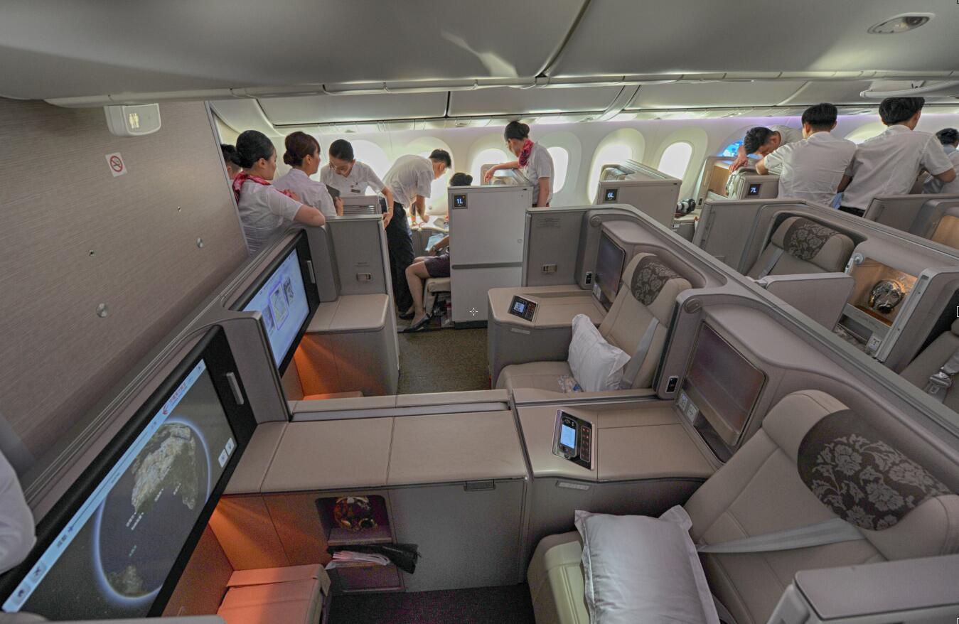 “梦想客机”的客舱体验也是梦幻级的,记者试坐发现,头等舱可以180度躺平,相邻四个座位的隔板可以放下,形成一个小型的私密会议室,说是“空中会客厅”一点也不为过。即使是经济舱,座椅宽度、前后间距也比一般的客机宽敞,坐下没有逼仄感。据了解,同为波音787系列,更新的787-9比787-8长8米,内舱空间容量更大,这一架飞机座位总数达285个。