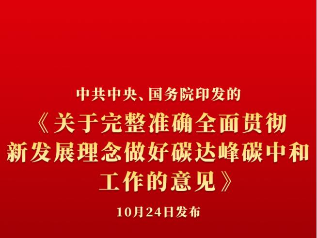 中共中央、国务院印发的《关于完整准确全面贯彻新发展理念做好碳达峰碳中和工作的意见》24日发布