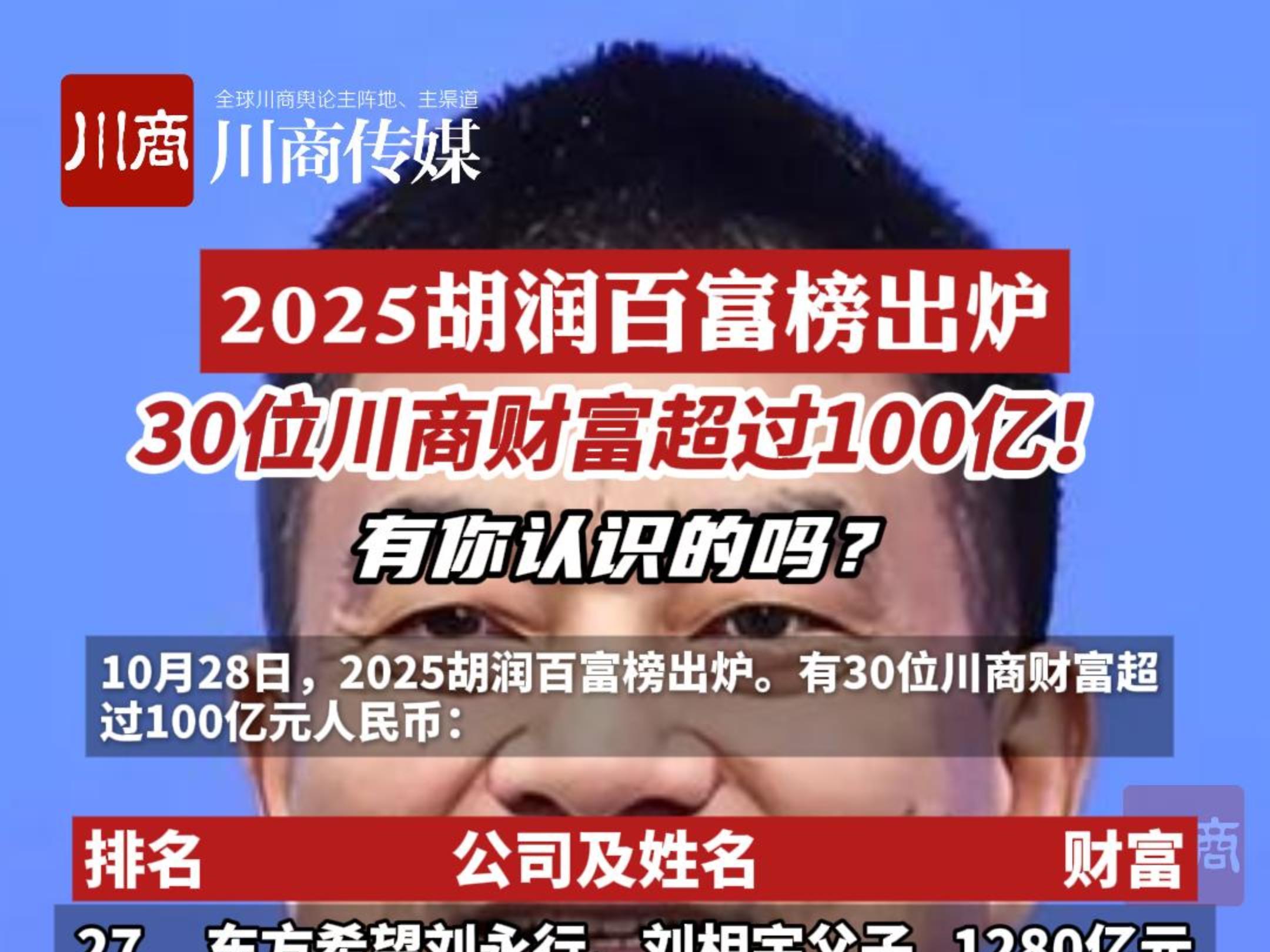 2025胡润百富榜出炉!30位川商财富超过100亿!