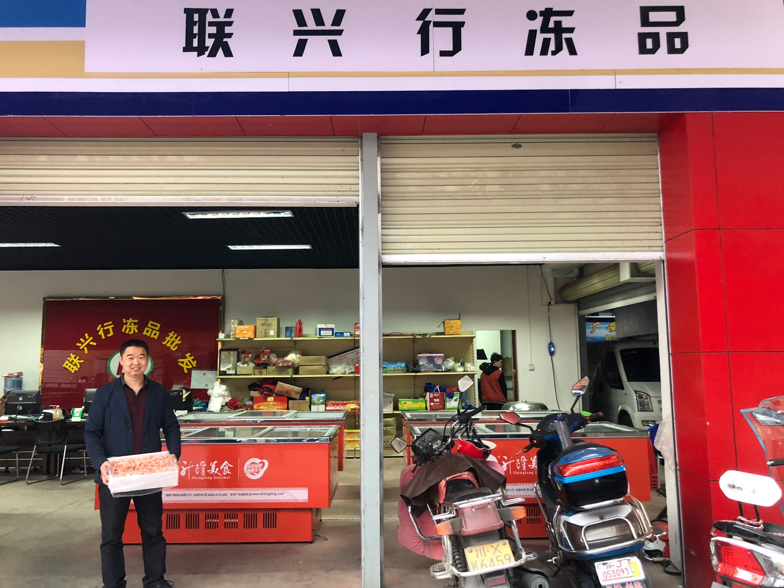 广安联兴行冻品批发部负责人叶德家捧着从广西防城港运来的无头虾。