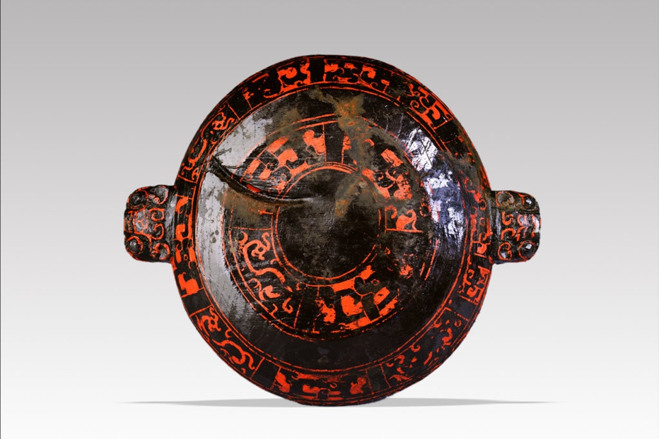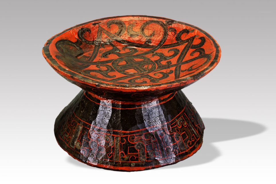 修复完成的床,可以看到通体髹黑漆。除了床的内侧,其余部位都用朱、赭两色绘制了庄严、神秘的回首状龙纹以及蟠螭纹。陈云洪说,蟠螭纹是春秋中期以后,中原青铜器上比较常见的一种纹饰。商业街的漆器纹饰选择了青铜器上的纹饰,可见当时古蜀与中原文化存在的紧密联系,甚至反映出蜀上层统治阶层向慕中原文化的心理。