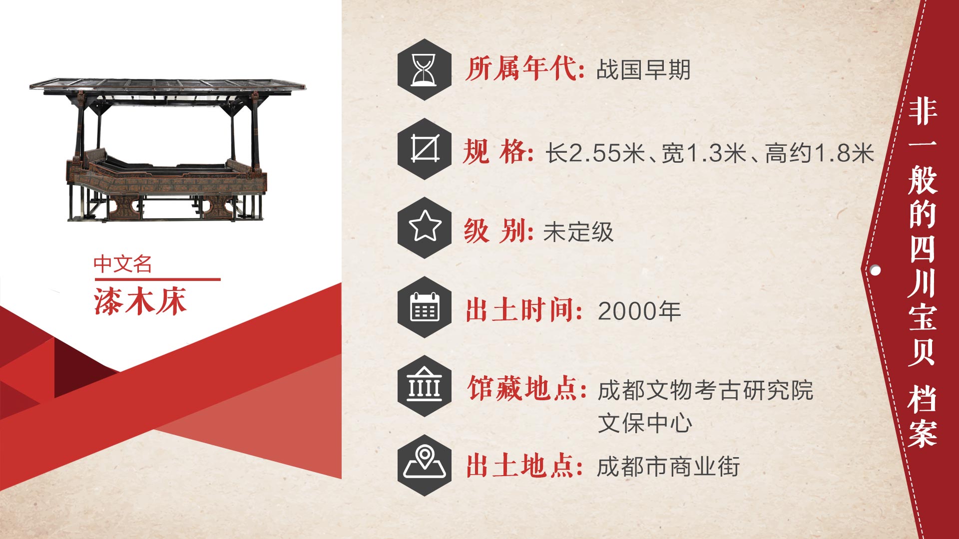 富丽堂皇的漆床和船棺葬出土的漆木编钟架、漆鼓、漆埙等乐器以及漆几、漆案等生活器具一起,留下了神秘的历史信息:商业街船棺墓,极可能是古蜀开明王朝时期的王族墓甚至蜀王本人的家族墓地。