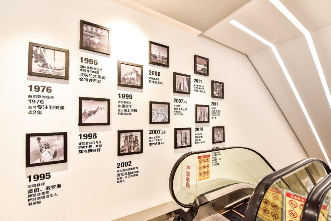 而且在墙面上展示了波司登的历史沿革及重大事件,将品牌的历史积淀与匠心精神进行视觉化传达给顾客。