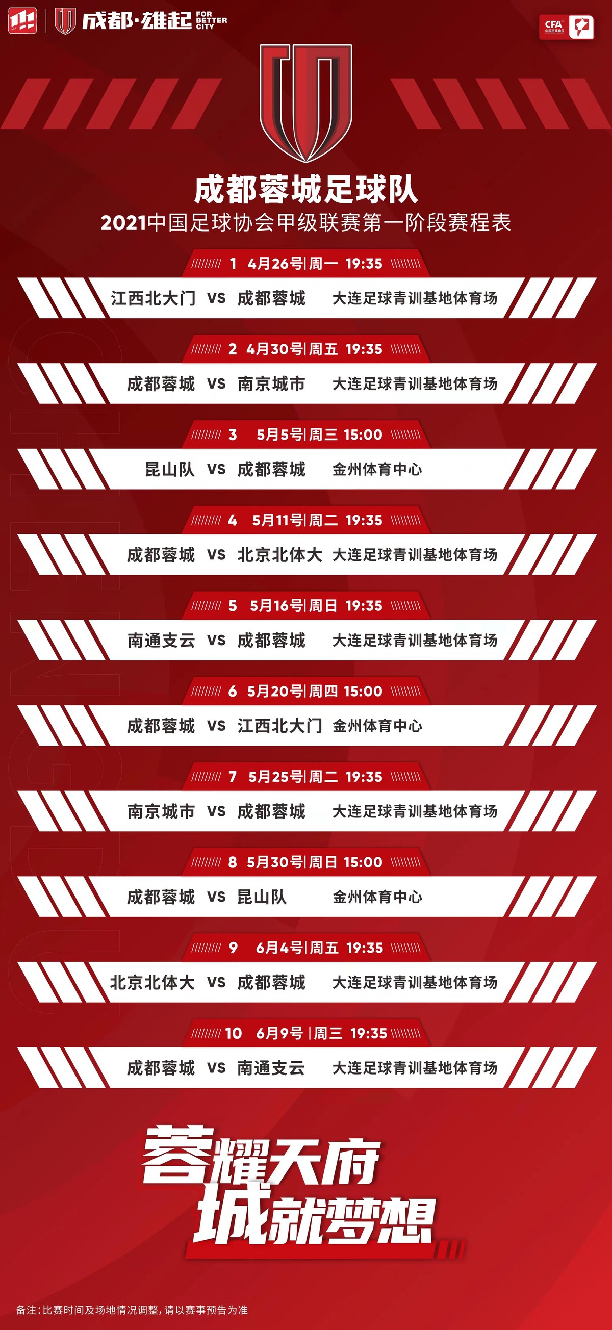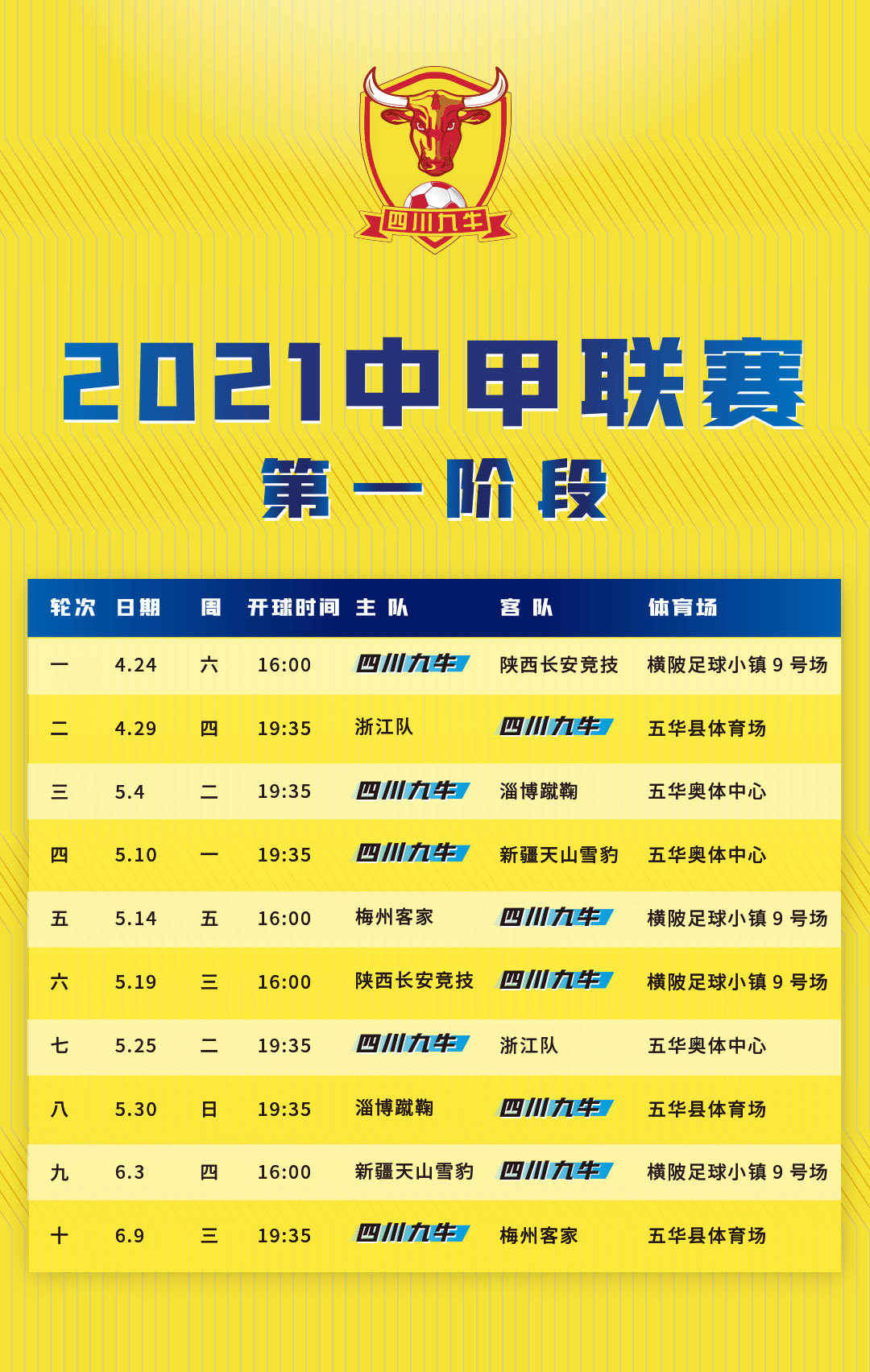 4月13日,中国足协公布了2021赛季中甲联赛第一阶段对阵日程表。本阶段赛事将在武汉,大连,梅州三个赛区举办,共进行10轮90场比赛较量,从4月24日持续至6月10日。开幕式将于4月24日晚在武汉五环体育中心举行。四川两支球队四川九牛、成都蓉城将分别在梅州、大连赛区作战。两支球队能否完成本赛季的冲超目标,第一阶段的表现至关重要。