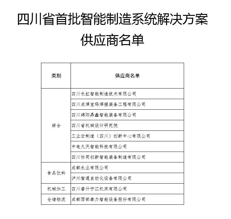 近日,省经济和信息化厅公布四川省首批智能制造系统解决方案供应商名单,四川长虹智能制造技术有限公司、四川成焊宝玛焊接装备工程有限公司等11家企业榜上有名。