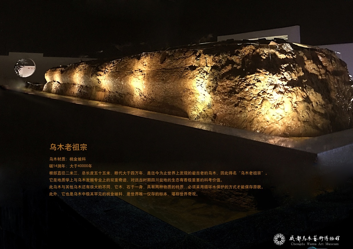 最古老的乌木已4万岁(黑)博物馆最古老的乌木,是一根世界唯一发现的石、木并存的乌木。经碳十四同位素测定,它存在的年代距今已大于4万年,是这里的“乌木老祖宗”。2008年,这根乌木在耗时4年之后,从四川某河道挖出。经测量总长55米,根部直径2.3米,重达百余吨。如今,存放在博物馆的只有14米,但它的科研价值不可估量。