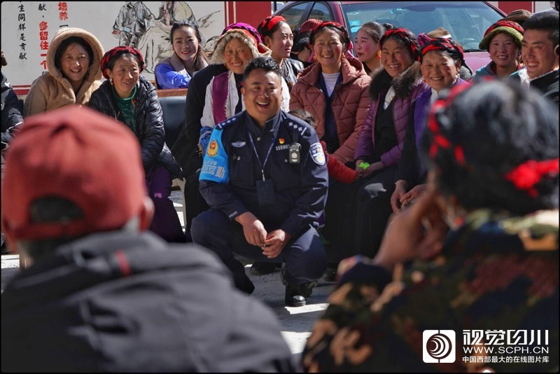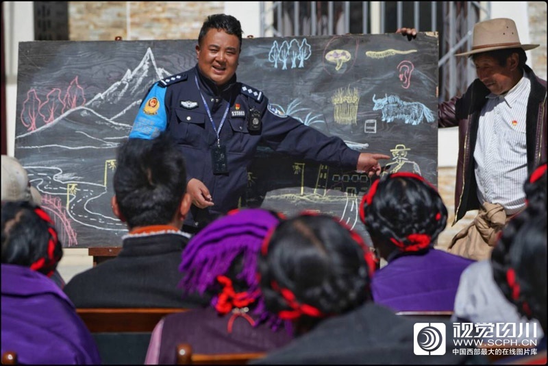 阳春三月,康定市甲根坝乡扎日村坝子里,村民们围在黑板前,认真听着民警巴桑呷瓦妙趣横生、诙谐幽默的“授课”,不时发出开心的笑声。巴桑呷瓦用粉笔在黑板上细腻勾勒出扎日村的地貌牧场民居,亲切的卡通农牧民形象,萌萌哒的牦牛、虫草、青稞、蔬菜、野山菌,用形象的白描绘画和生动的言语,宣讲党的政策和国家法律法规,为农牧民描绘脱贫致富“明白账”。他用画笔架起了警民沟通之间的“心”桥梁,他被当地农牧民亲切称为“容纳”(藏语里画家的意思)好民警。