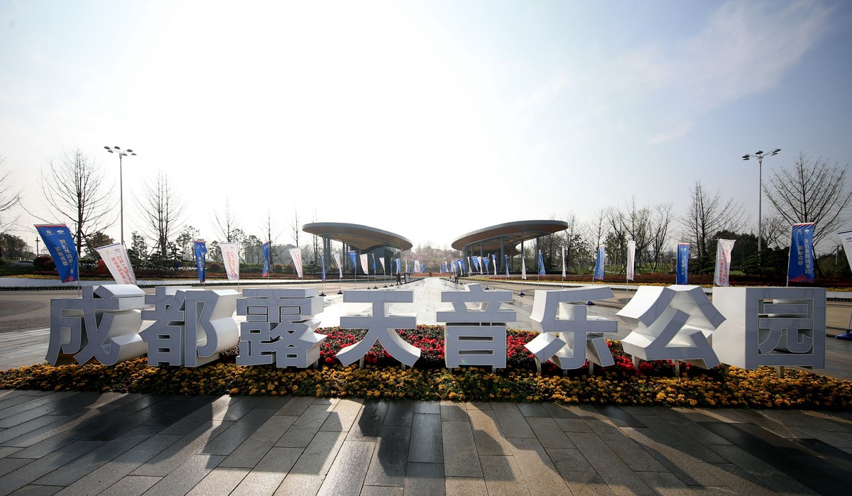 成都露天音乐公园位于成都市区北部新城,地处凤凰山浅丘陵地带,整个公园以主舞台演艺中心为核心,主舞台采用钢结构与索膜结构构建的双面观演的舞台,是目前世界最大的全景声半露天半室内双面剧场,朝室内能容纳5千人观演,朝室外能容纳4万人观演。