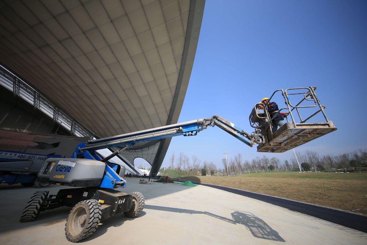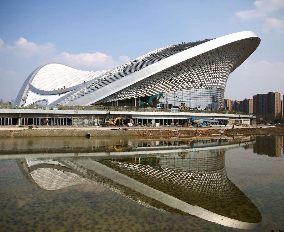 “我们采用了双斜拱承双曲抛物面索网结构,属于国内首例。”张敏介绍,主要由两根双曲抛物面主拱,7字型桁架结构、落地拱以及网壳等部分组成,几乎涵盖了钢结构施工的所有结构形式,堪比一座小型的“钢结构博物馆”。