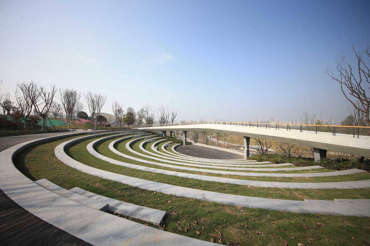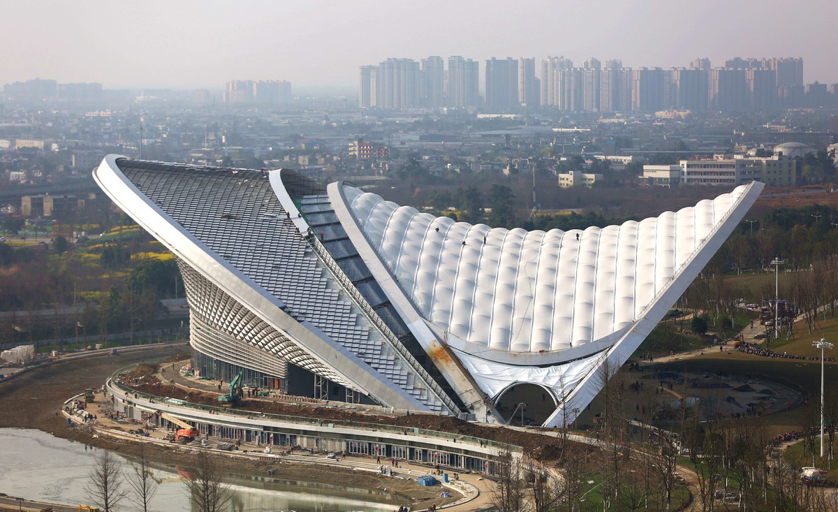 在成都露天音乐公园,半开放的舞台上撑起一块穹顶天幕,像一张展开的滑翔伞“罩”在舞台上。主舞台为环形结构,三面闭合、正面向草坡观演区开放。当举办大型演唱会或音乐节时,面向主舞台的自然坡地将成为观众的大看台,可容纳4万人的大草坪将变成欢乐的海洋。
