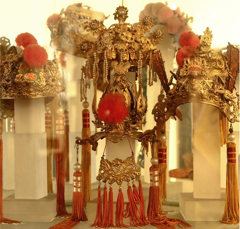 陈列在博物馆的众多川剧头饰,被认为在中国的戏曲种类中是最为精致的。熊剑说,做王帽,头饰上必须盘龙。这些龙由硬纸壳或木板做底,外饰金粉,看上去耀眼夺目。尤其体现手艺的是,师傅们做的龙是立体造型,甚至龙的鳞甲也一点点刻画出来。这样的硬盔头帽,戴在头上自然英姿飒爽。“如今,川剧的头帽大都采用外剧种的,很多已经简化成绒球装饰。渐渐失去了川剧自有的特点。”