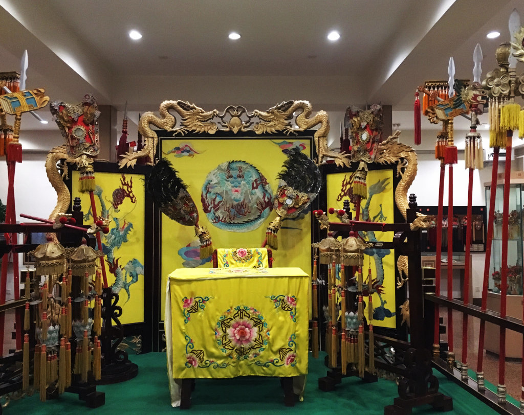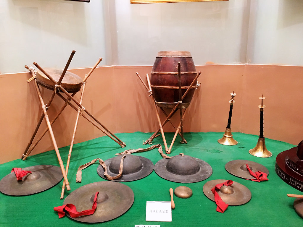 在川剧艺术博物馆,可以看到全套的川剧打击乐器堂鼓、大锣、小锣、小鼓、大钹、唢呐等实物,也可以看到完整呈现的川剧金銮殿等演出场景。熊剑说,戏曲演出要在方寸舞台间表现各种场景,就少不了程式化的一些规定。比如川剧中的金銮殿,整体采用明黄的帝王色布置,座椅后的屏风饰五爪金龙,殿前有香炉、掌扇等“帝王特供”的道具。舞台两侧,还有御林军使用的金瓜、月斧、朝天蹬等仪仗用具,“舞台上的道具显然比不上真实的金銮殿,但观众一看就知道这是什么演出场景。”