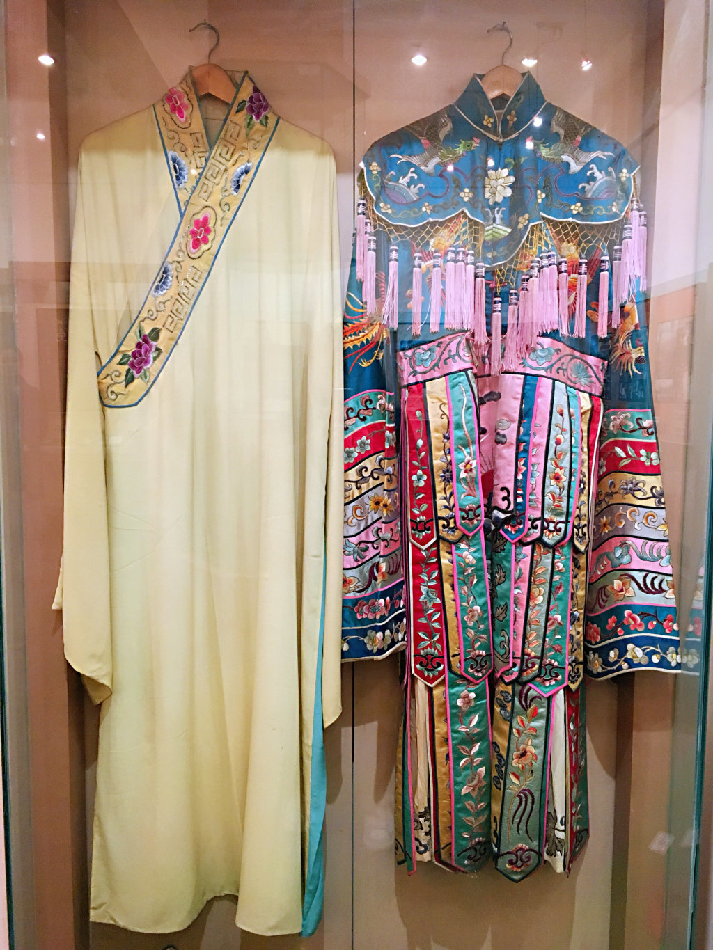 博物馆还保留着不少阳友鹤、曾荣华等川剧大师曾经用过的服装,这些手工缝制的服装,以现在的标准来看堪称奢侈品。熊剑说,戏剧服装很多都是丝绸,其上的纹饰都是手工刺绣,现在一套做下来要花掉一两万元。幸好这些戏服在不同的剧目中可以重复使用。成都市川剧院上世纪八十年代置办的部分戏服如今仍在使用。每次演出完毕,工作人员会在衣服上喷洒酒精再晾晒保管,使用寿命可达几十年。