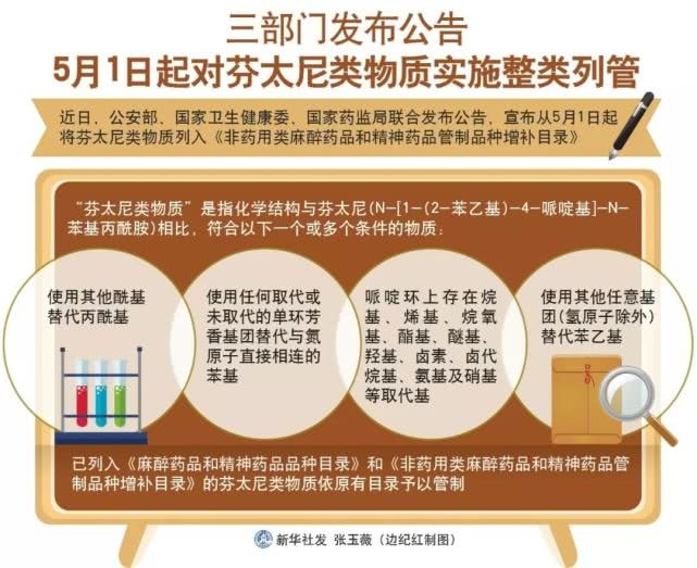 ●近日,公安部等三部门发布公告,宣布从5月1日起将芬太尼类物质列入《非药用类麻醉药品和精神药品管制品种增补目录》。
