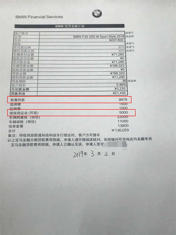 林丽称,购车时她就对这笔9979元的“前置利息”提出疑问,销售人员说是金融服务费。“我说我要跟市场监管部门咨询是否合理,他(宝马4S店工作人员)就说,这样的话,建议我去其他门店购车。”